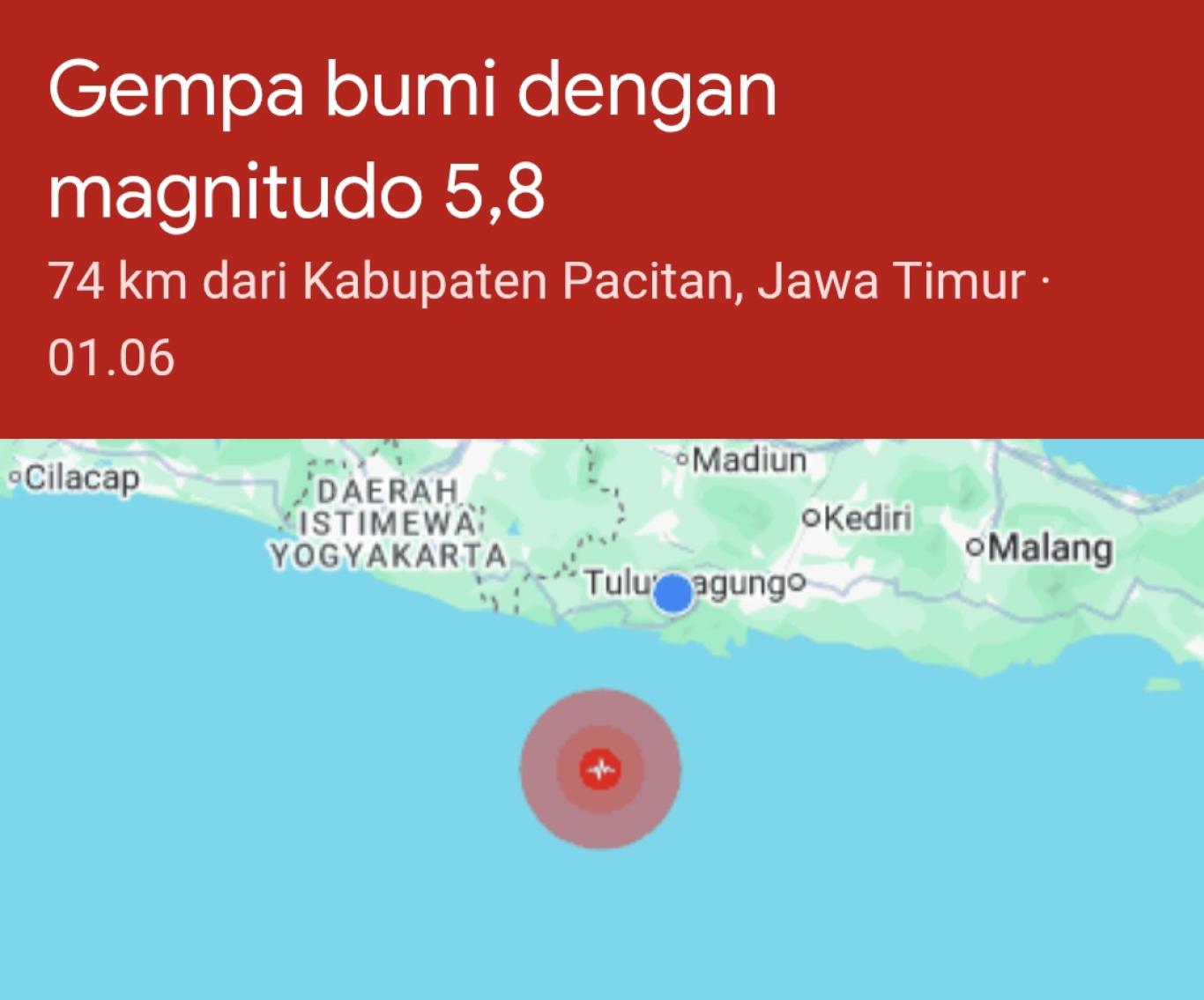 TRENGGALEK – Keheningan malam di wilayah pegunungan Desa Puyung, Kecamatan Pule, Kabupaten Trenggalek, berubah menjadi kepanikan sesaat pada dini hari tadi. Gempa bumi berkekuatan Magnitudo 5,8 yang berpusat di 74 km arah barat daya Pacitan memicu guncangan hebat yang dirasakan sangat kuat oleh warga setempat.