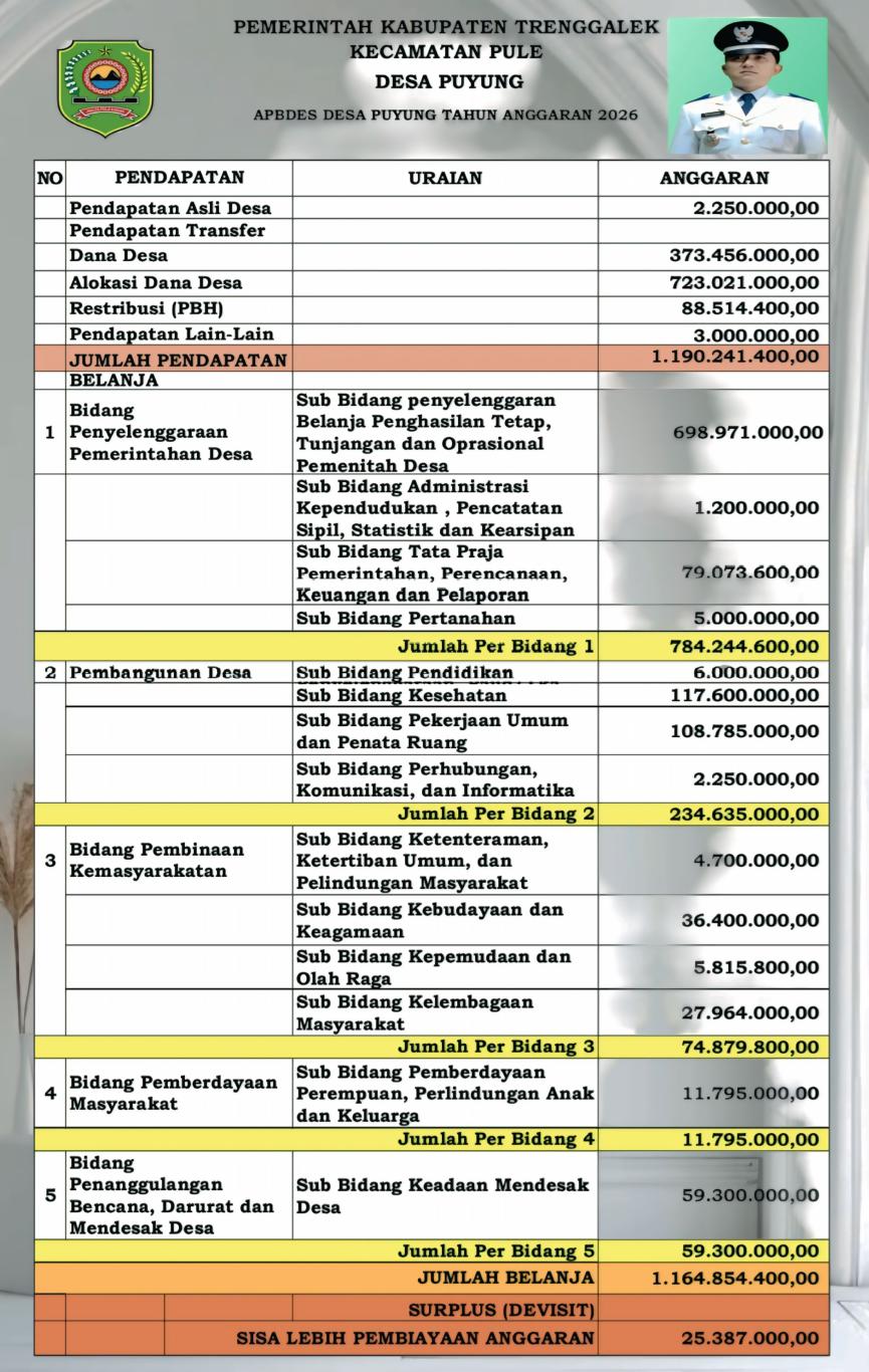 TRENGGALEK – Pemerintah Desa Puyung, Kecamatan Pule, Kabupaten Trenggalek, secara resmi merilis rincian Anggaran Pendapatan dan Belanja Desa (APBDes) untuk Tahun Anggaran 2026. Langkah ini dilakukan sebagai bentuk komitmen pemerintah desa dalam mengedepankan prinsip transparansi dan akuntabilitas tata kelola keuangan publik kepada seluruh warga desa.