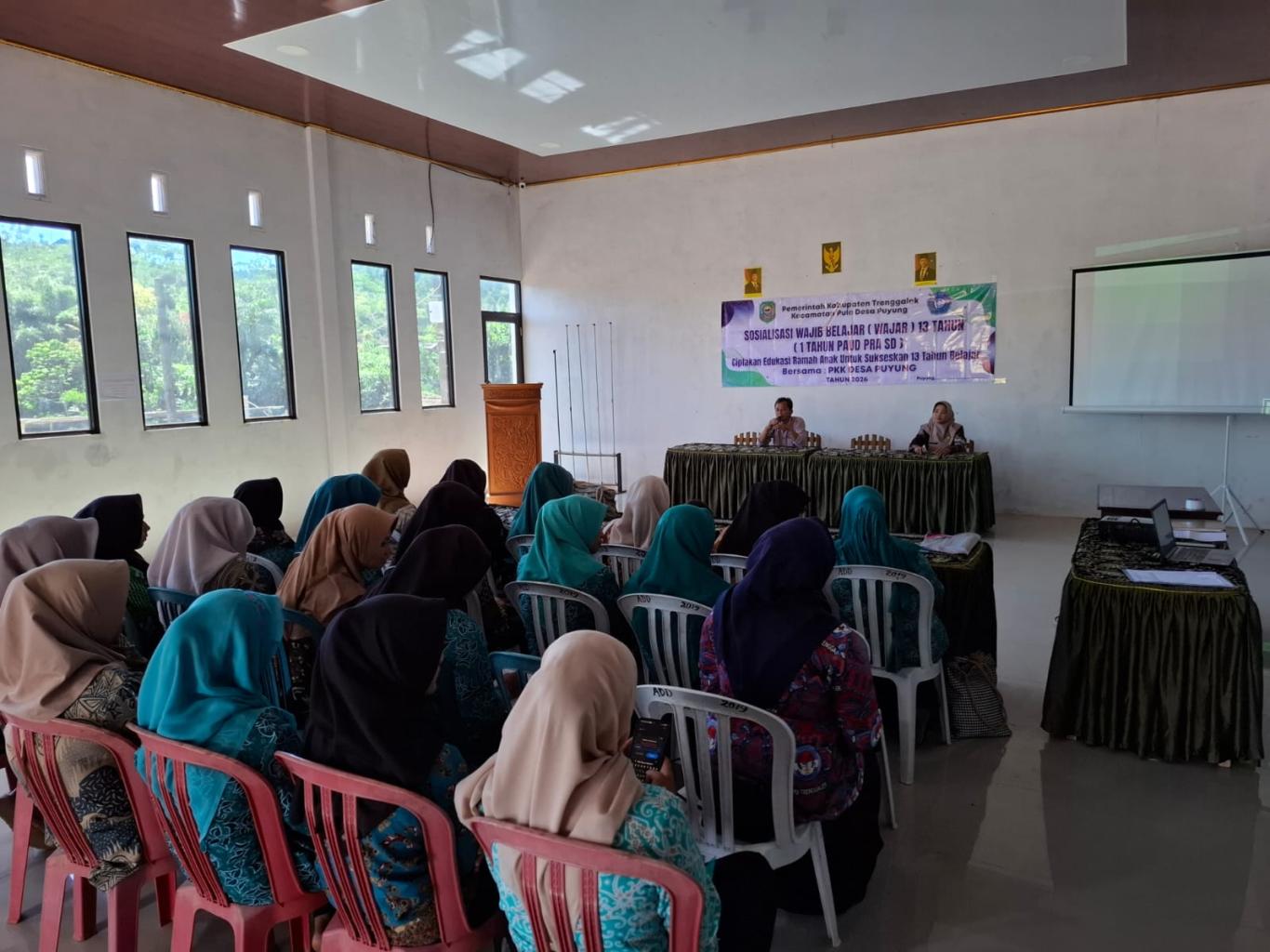 Puyung – Pemerintah Desa Puyung, Kecamatan Pule, Kabupaten Trenggalek, menggelar kegiatan sosialisasi program Wajib Belajar (Wajar) 13 Tahun pada Kamis, 23 April 2026. Kegiatan ini berlangsung di balai desa setempat dan dihadiri oleh kader PKK, tokoh masyarakat, serta warga yang antusias mengikuti jalannya acara.